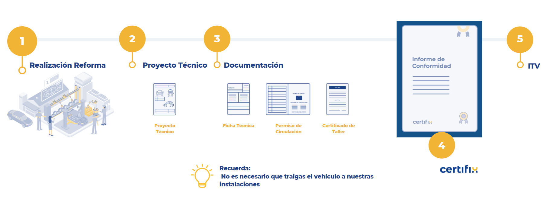 Nuestro procedimiento de homologación de vehículos se resume en los siguientes pasos: crea tu cuenta en Certifix y solicita la reforma adjuntando los documentos que te solicitamos. Una vez subida la documentación, uno de nuestros expertos evaluará tu reforma y se pondrá en contacto contigo por si necesita algún dato adicional. Si todo está correcto y en regla te llegará un enlace de pago y, una vez completado el mismo, te enviaremos un correo con el link para descargarte nuestro informe y ¡listo! Así de sencillo.